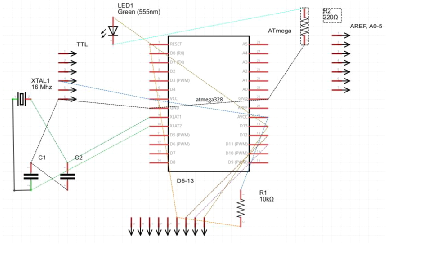 We will pick up the power to the Bootloader Shield from the TTL pins 4 and 6, The MOSI, MISO and SCK pins are pin 17, 18 and 19 respectively on the blank Atmega 328 and are connected to D11, 12 and 13 on the KMDuino. Reset is connected to D10 with a 10K ohm resistor from +5V. Because we want to program the device using its own clock source, we have added a 16mHz Xtal and two 22pF capacitors. Lastly we have added an LED and pull up resistor to display the read/write function (it will flash during the upload process).