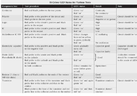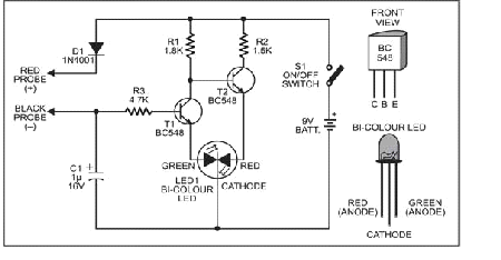 The circuit is extremely simple and exploits the biasing property of bipolar transistors. Transistors T1 (Q1) and T2 (Q2) act as transistor switches driving the red and green halves of bicolour LED1 independently to give results of the test.